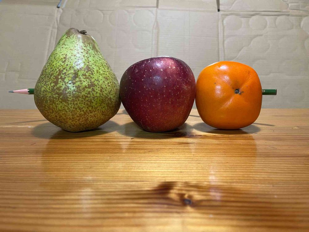 リンゴの後ろに置いた灰皿の窪みにえんぴつを2本ギュッとして 水平の目線で写真撮ったらこう見えたって訳なんですねー