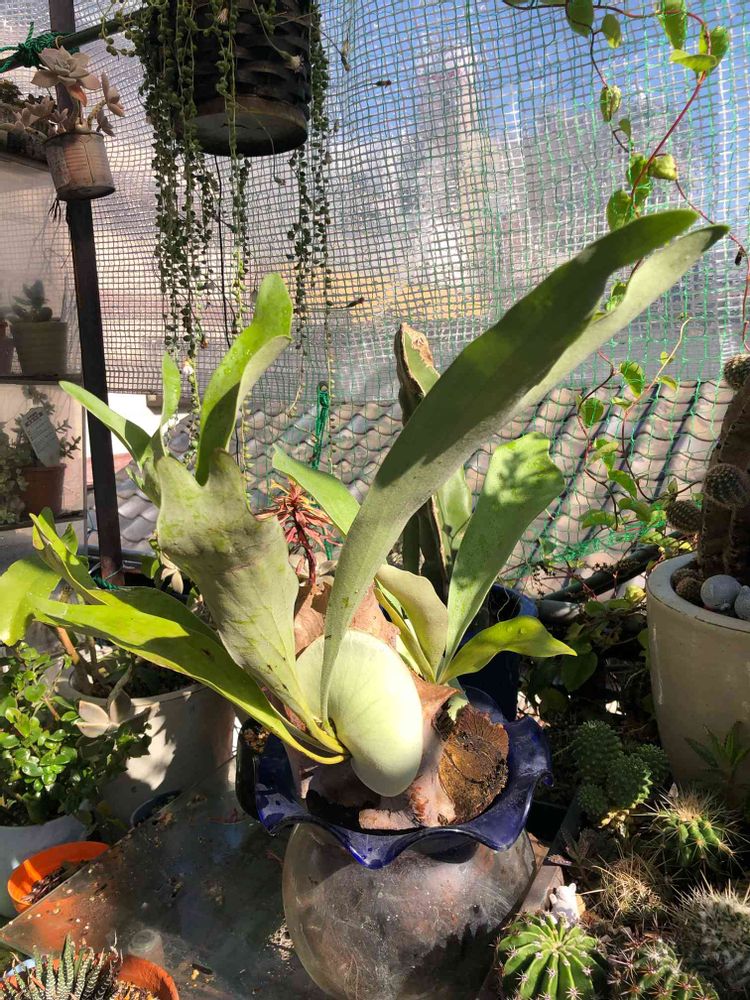 透明ビニールシートを被せているので雨が防げます。でも風が強いと吹き込みますけどね!😅コウモリランは鉢植えだったのですが鉢から抜いて金魚鉢にすっぽり入れました。透明だから水がたまらない様に気を付けています。貯水葉も大きく広がって