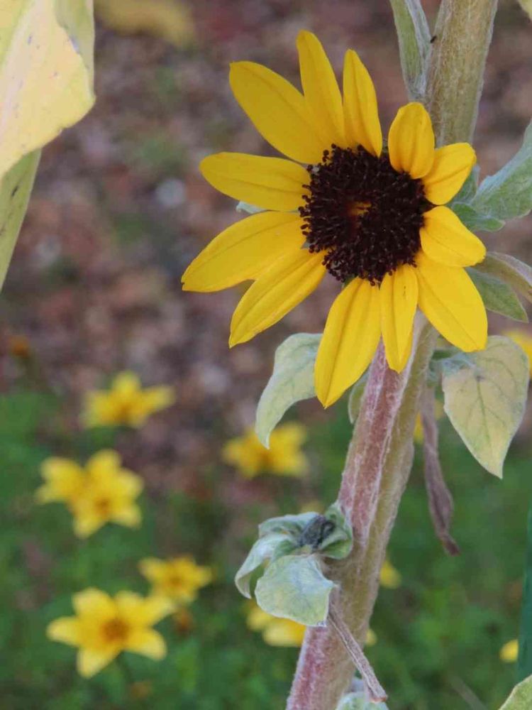 まだ頑張って咲いてるヒマワリさんが下のビーダンスさんと見つめ合ってるようでした。