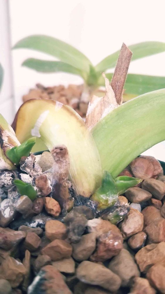 名無しパフィオ。不健康そうに見えるけど、芽が出てきたので