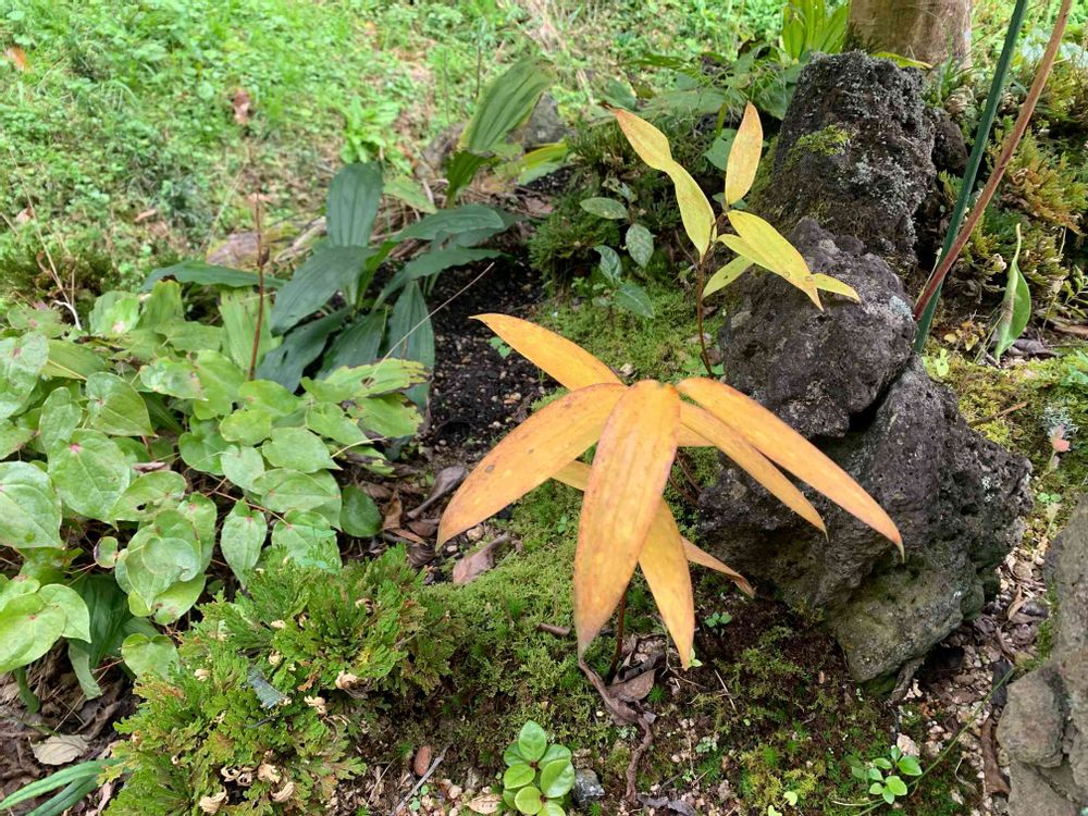 いろいろ寄せ植えの坪庭😅💦笹百合が紅葉しています😀