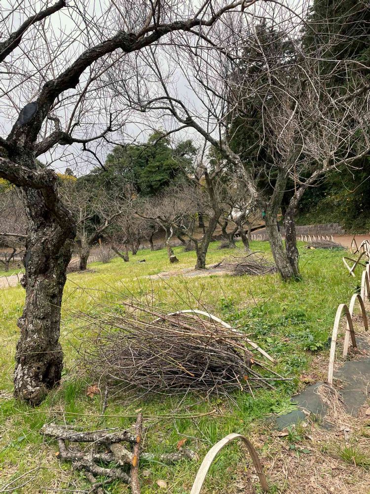 2022ー11ー20(日)🌫️🌧️雨が落ち始めました 梅園では春に向けての剪定が始まっていました。
