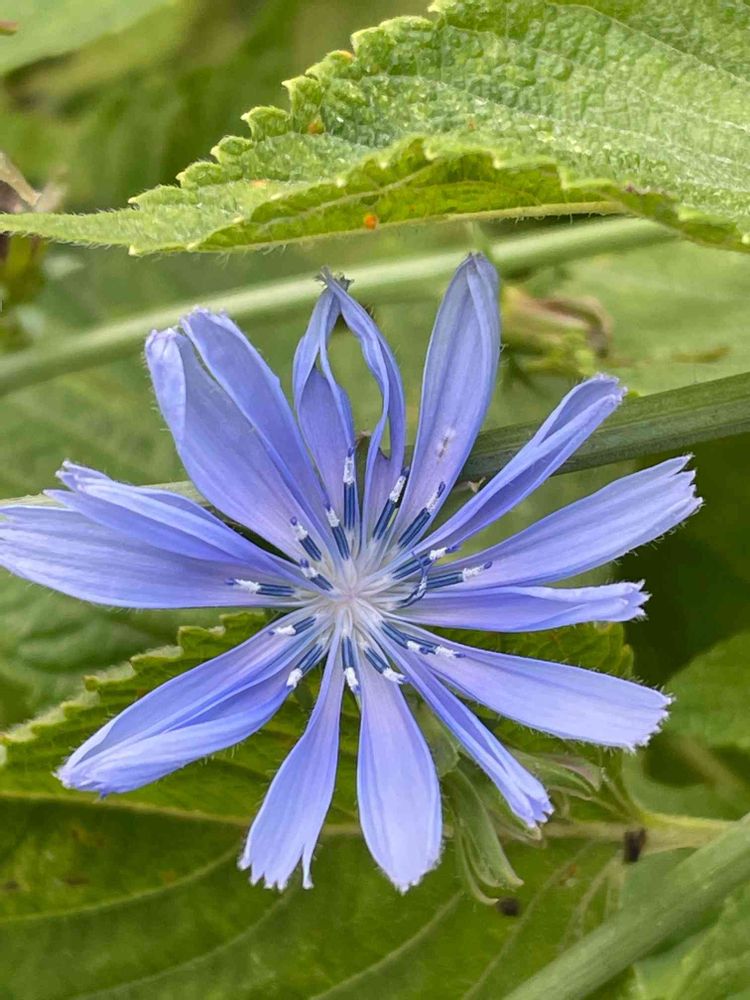 何かの葉っぱの間からひょこっと顔出したチコリの花🥰