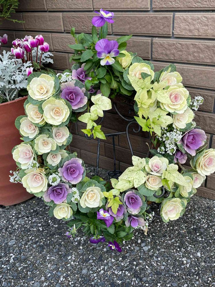 初めてハンギングリースを作成しました。葉牡丹、ビオラ、斑入りへデラ、アリッサムです。少し白かった感じですが、出来栄えは満足しています。
