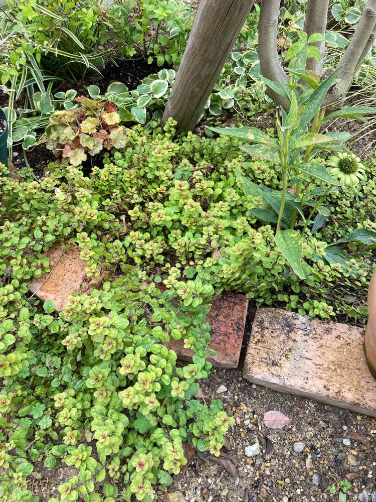 もともと寄せ植えに使っていたオレガノ(品種は多分、マルゲリータ?)を地植えにしたら良いグランドカバーになりました👍レンガの花壇を乗り越えて進出してます🤭
