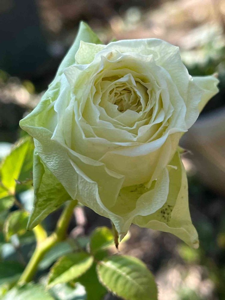 バラ アンバティーク🤍💚先日より少し開いてきました🎊開いて欲しいような欲しく無いような…昨日は一日中雨が降っていましたが☔️このバラは雨晒しだったけど大丈夫みたい🙆♀️