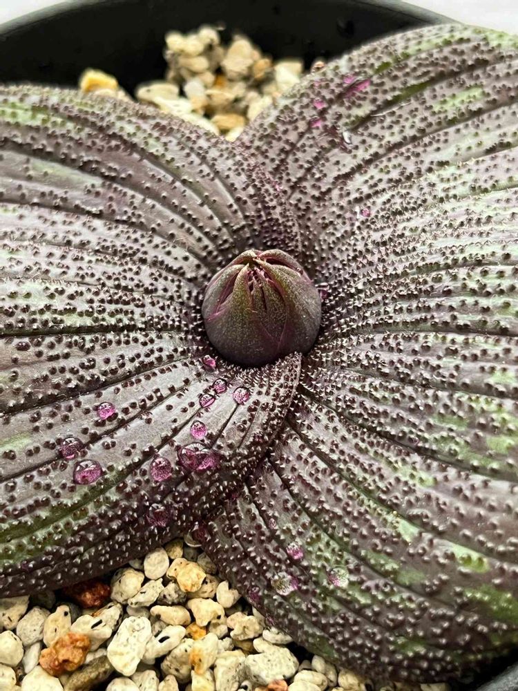 ダークな葉っぱの色が透けて紫色の水滴に見え綺麗✨💜