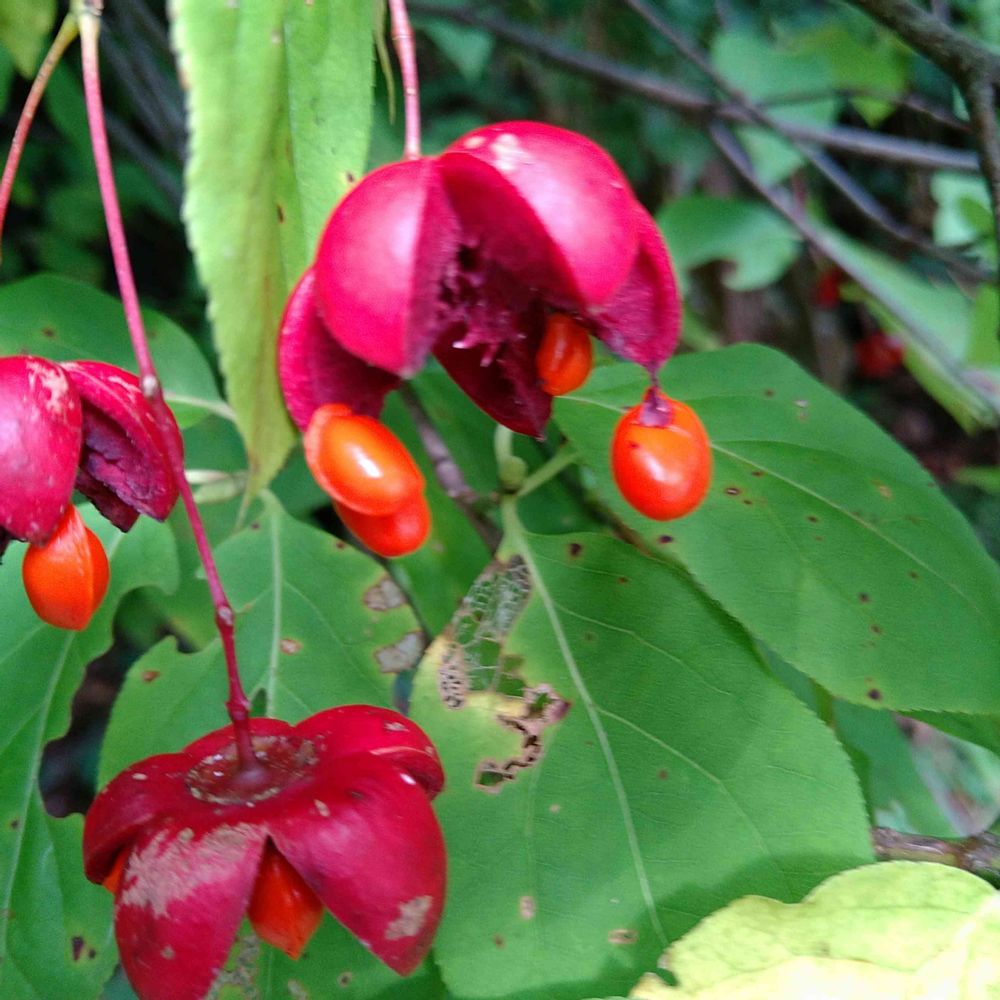 パカッと開いた実を閉じて復元すると四角ではなく丸!マユミではなく、ツリバナ。マユミは実の色もピンク(種はいずれも赤)