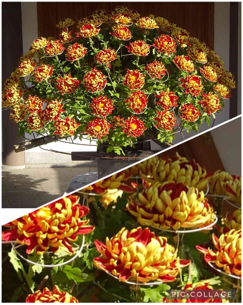 この「巴錦」(ともえにしき)は、花びらの内側が深紅、外側が黄金色の大変豪華な色が特徴の古典菊です。