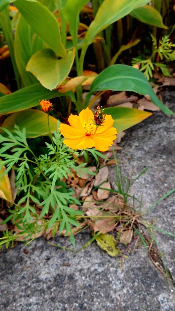 近所の川べりで見つけたキバナコスモス🏵 よく見ると、あら不思議👀 花びらの間から、別のつぼみが突き出ています🧐😮😀