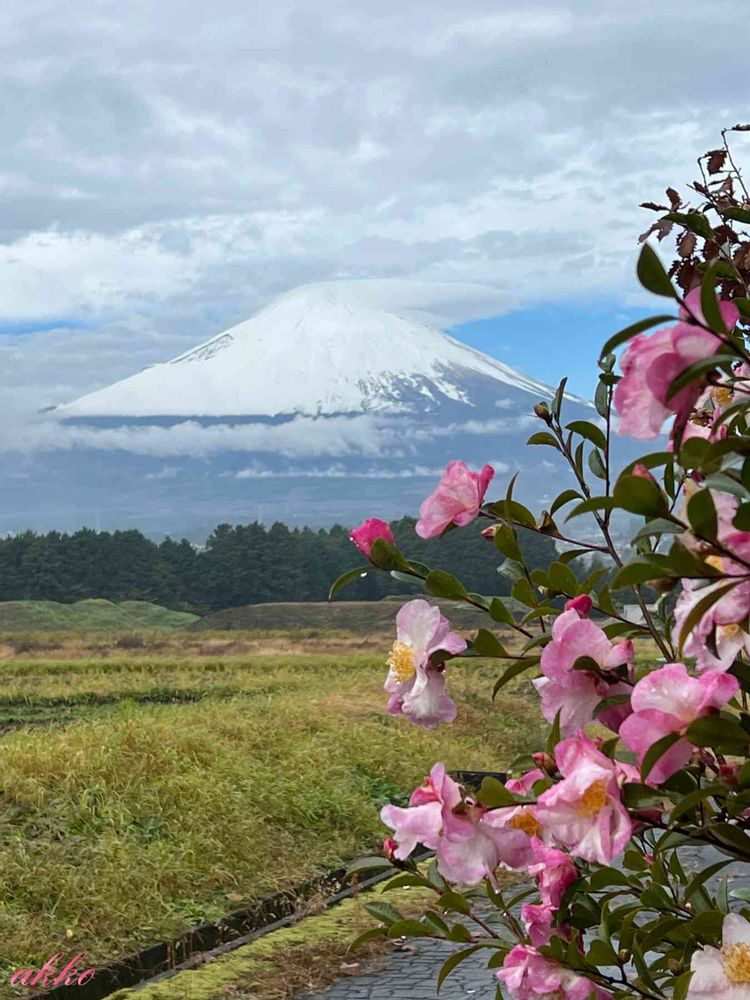 富士山に雪が降りましたねー〜😍 山茶花と富士山🗻とてもステキです。😊