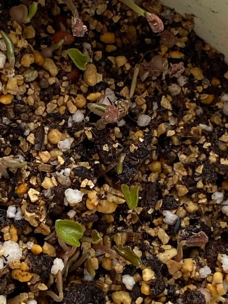 ガーデンシクラメンとシクラメンの種まきから1ヶ月後芽が出ました。もやしみたいでちゃんと育つかな