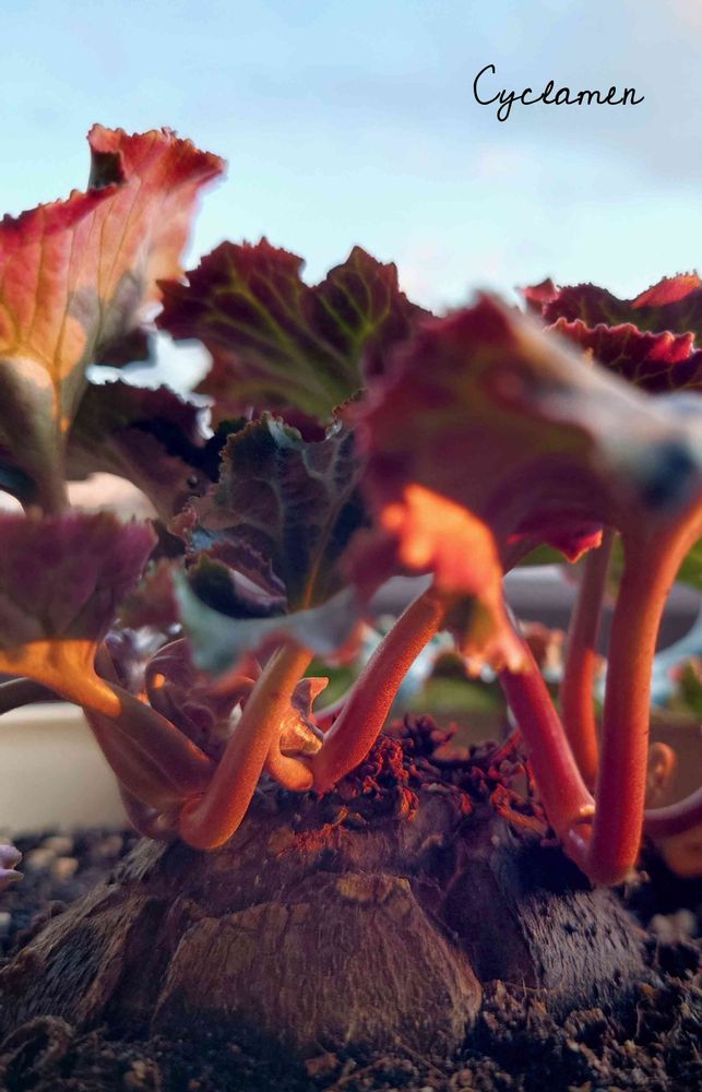 株元、亀の甲羅のように割れているのはシクラメンの球根です🐢
