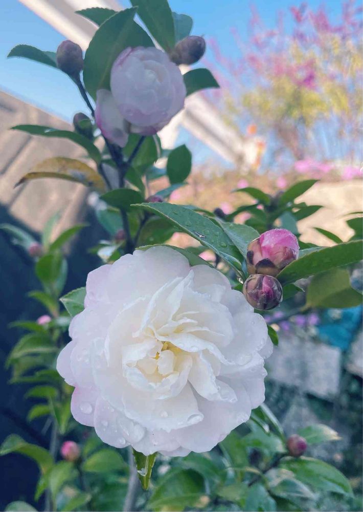 昨年やってきた憧れのサザンカ八重です。初めて咲きました😊蕾がピンク色なので白と間違って買っちゃったか…と心配してましたが開くと白でした🤭❣️