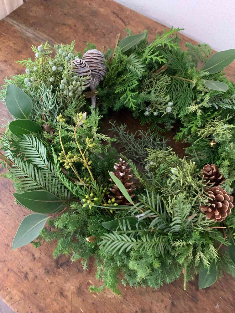 クリスマスリースは、お花の教室で作りました🎄毎年同じような雰囲気のグリーンリースです。
