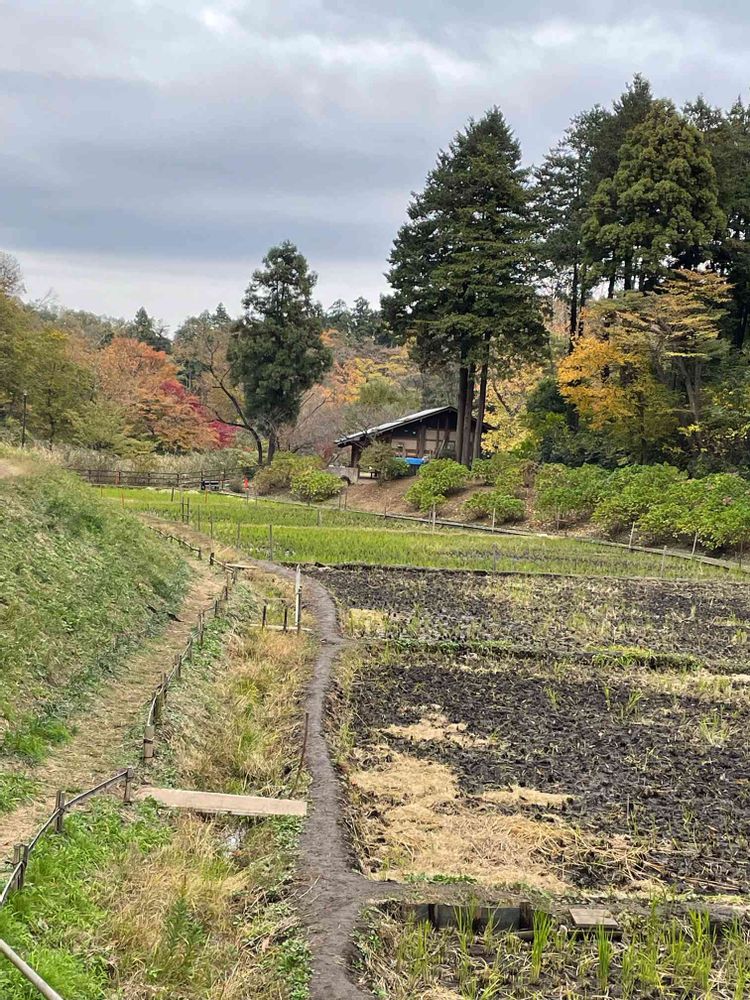 2022ー11ー22(火)🔹☀️🔹晴れ 公園には近くの幾つかの小学校の学習田畑 稲刈り後ですネ 左側に散歩道 右は森へと入ります。