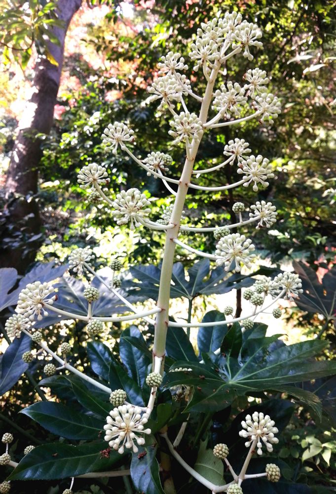 秋から冬にかけて、刺繍のモチーフのような丸い白花をつける「八手の花」が、お散歩道に沢山咲いていました🤗🎶