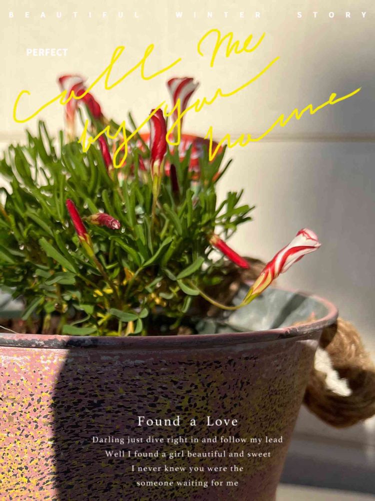今日の茶色の鉢に白赤のお花ஐ〰ฺ・:*:・✿ฺ きいろのもじ