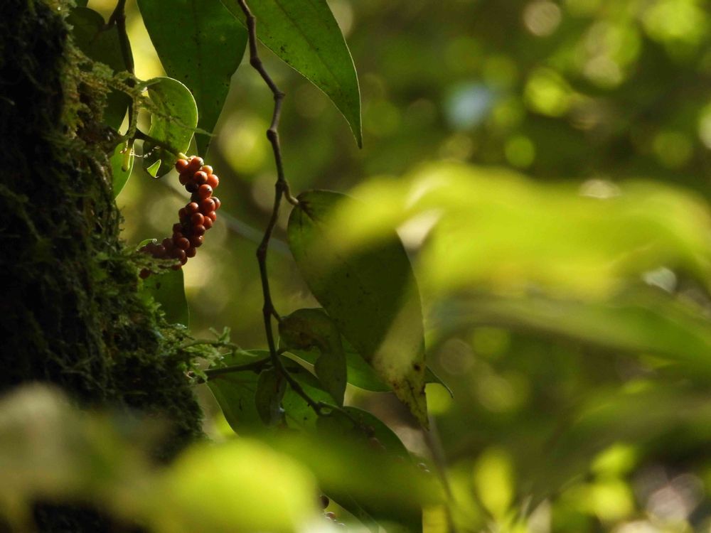 足元ばかり、見て散策。お宝と遭遇しないかもと、見上げることにした。木漏れ日に何やら、赤い色がチラホラ。目を凝らしてみると赤い実のようにも見えた。カメラで見てみると果実だった。
