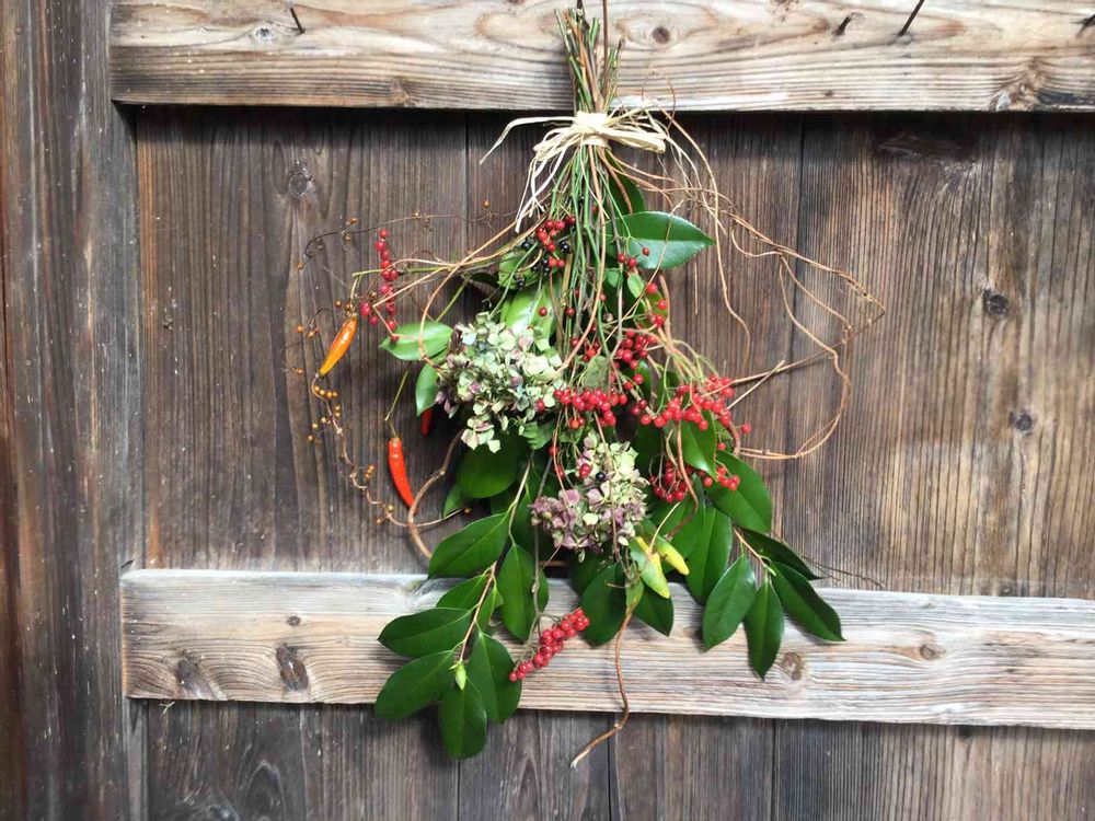 冬のスワッグ出来ました。自家製の実、葉が主体です。ガマズミ、イノバラ、トウガラシの赤に魅かれて作りました。つるはホップ、ヘクソカズラ。この茶色もアレンジに良く合います。