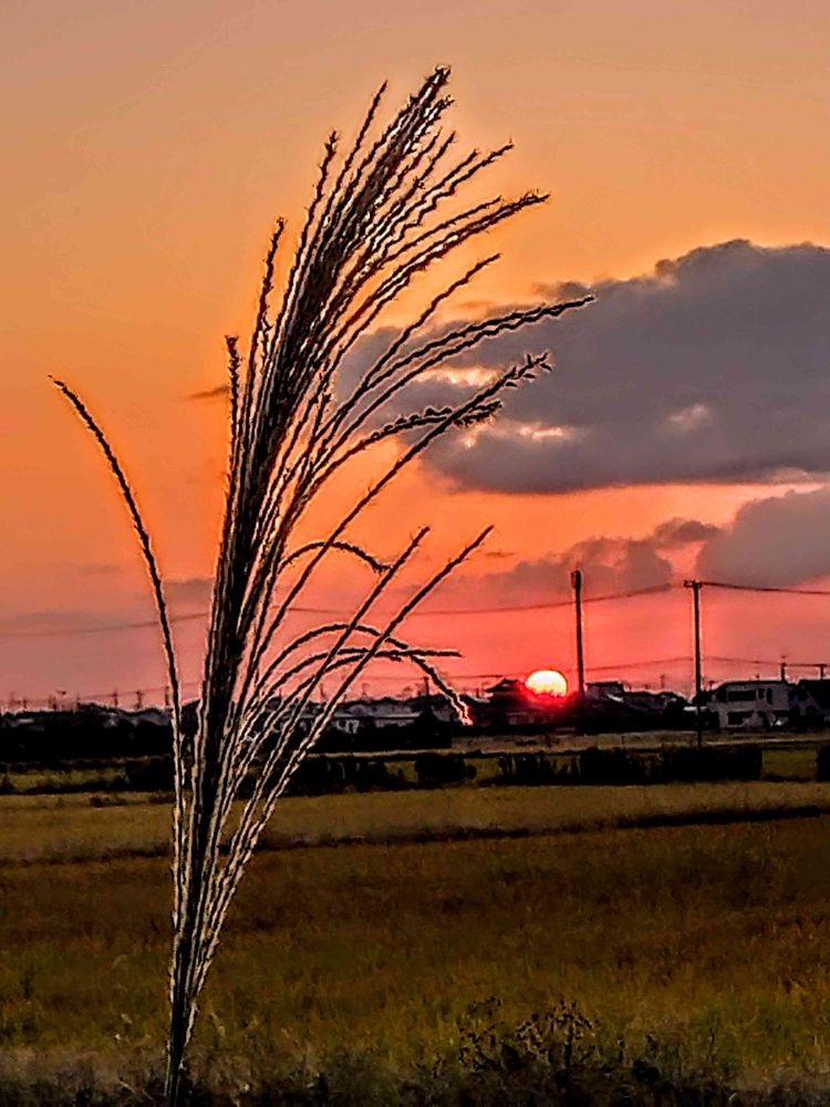 夕陽を眺めながら歩いている時にすすきの穂が重なりました😃