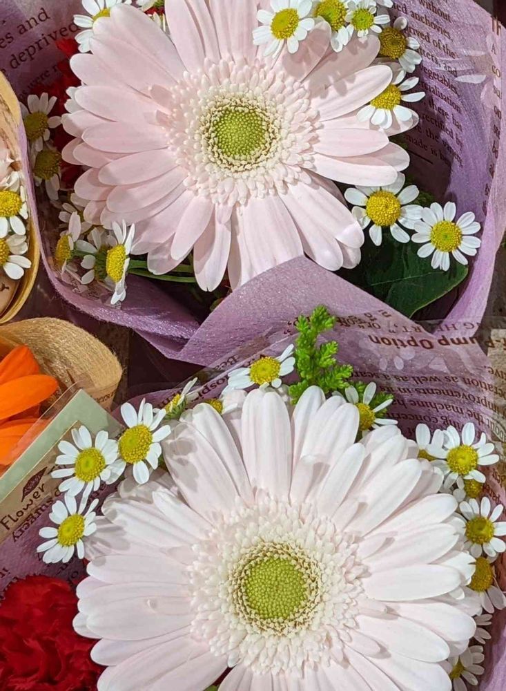マトリカリアに薄ピンクのガーベラ