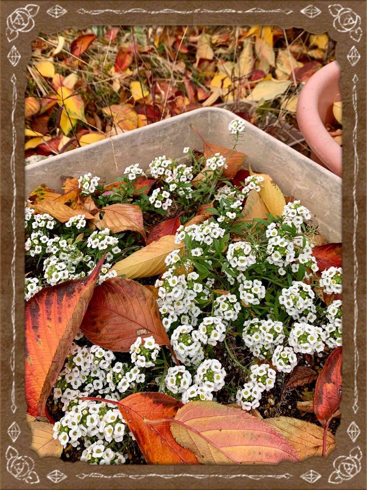 桜の紅葉した葉っぱっていいですね、可憐なら白いアリッサムとひき立て合って素敵な共演🍂