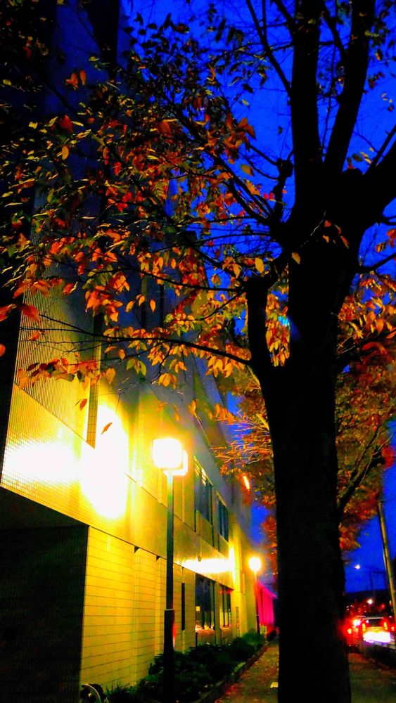 空の青、灯の黄、ケヤキの葉の赤茶色の組み合わせに癒されました。