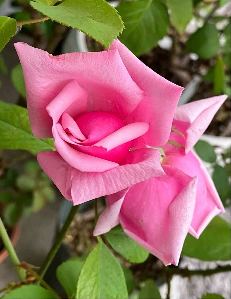 根本から4本のシュートが出てきた、ピンチのタイミングが遅くなり、2本が蕾が付いてしまい細い。元々枝が柔らかいバラなので、垂れて咲いてます🌿