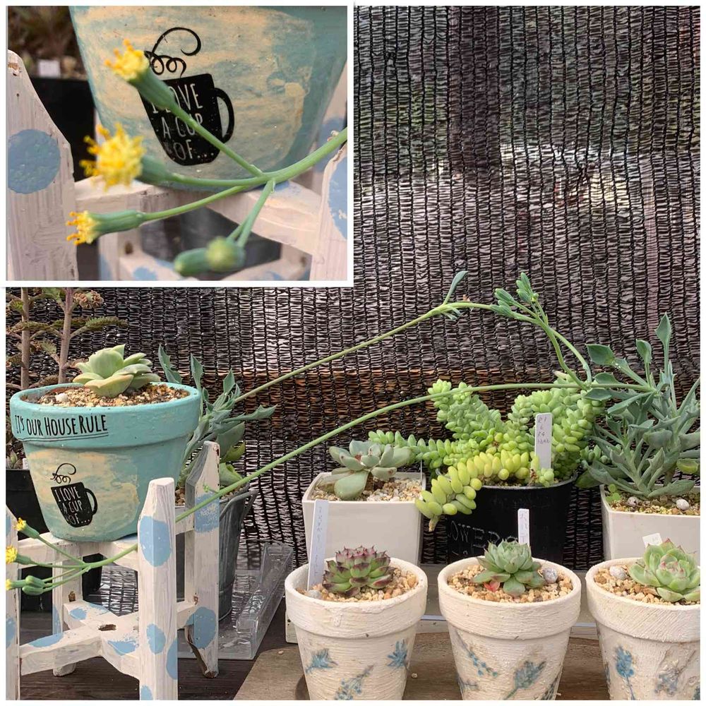 マサイの矢尻の花を見たいと、友人Tがいうので、そう言えば私も見た事がないと思い、咲かせてみたら、花芽が伸びに伸び、2鉢ある花芽が垂れて咲きましたが、こんな花でした❗️…(^^;)