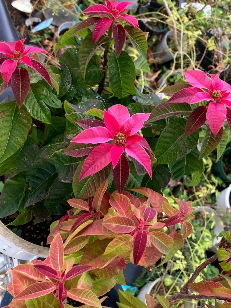 プリンセチア🎶3年目のものになります。何もせず、株だけ大きくなるので、鉢替えして、一つは、良い感じに、色付いてきました。もう一つは今一つですが、頑張っている様子が伝わります😸🎶