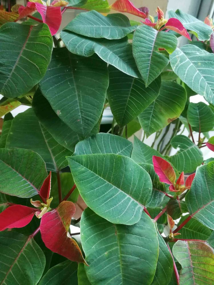 ポインセチアが随分赤くなってきた。葉脈がとても美しいと思った。てっぺんから鉢底までの高さが、今測ったら90センチになっている。毎年クリスマスの時期に贈ってくださる方がいて毎年春になる前に枯らしてしまっていた。3年前に頂いたこのポインセチア春まで持つかヤキモキしながら何とかもたせたら、夏の管理がとっても楽なのにびっくり。葉もワサワサ出てきて外でほっぽりっぱなしでも大丈夫なことにも驚いた。その後GSでとても丁寧なみどりのまとめを公開していらっしゃる方の育て方を参考に短日処理などもやってみた。