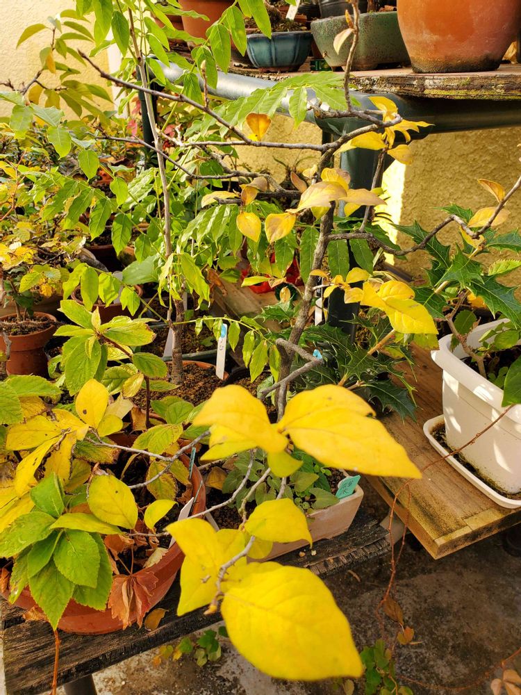 イロイロ写ってますが、手前にある黄色く黄葉した老鴉柿の雄木。