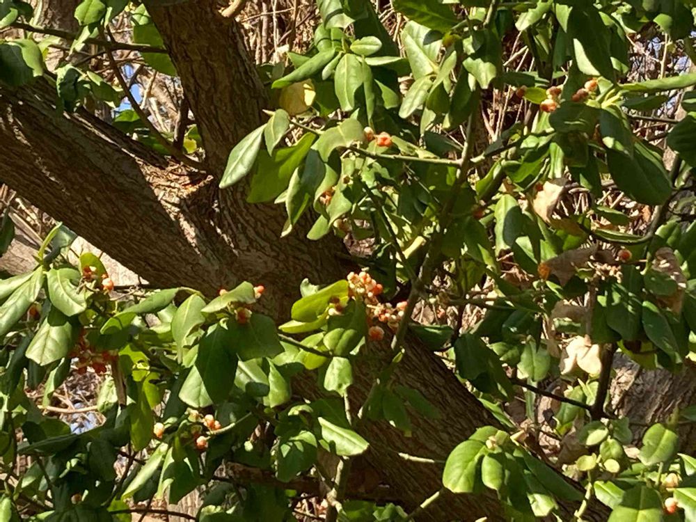 葉がほとんど落ちた林でひとり青々としたツルマサキ(たぶん)。