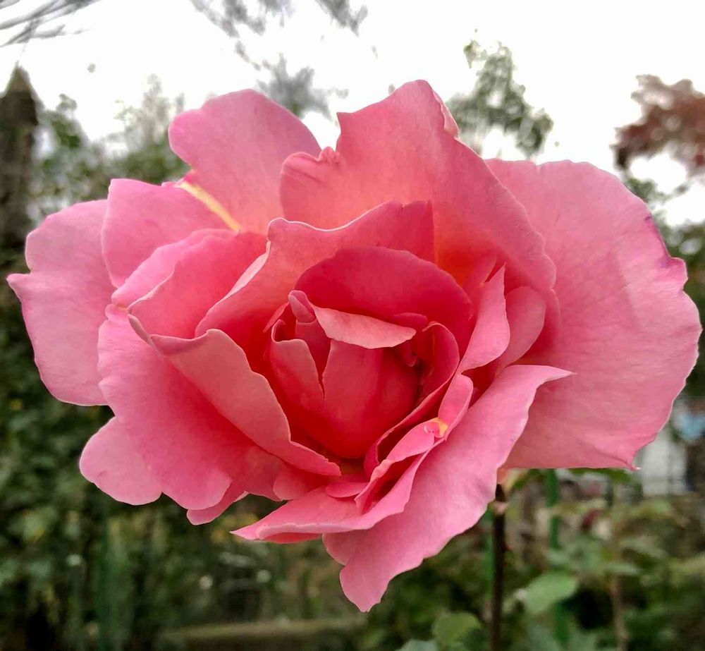 曇り空の下、透き通るような💖薄ピンク色の花が咲いています🥰