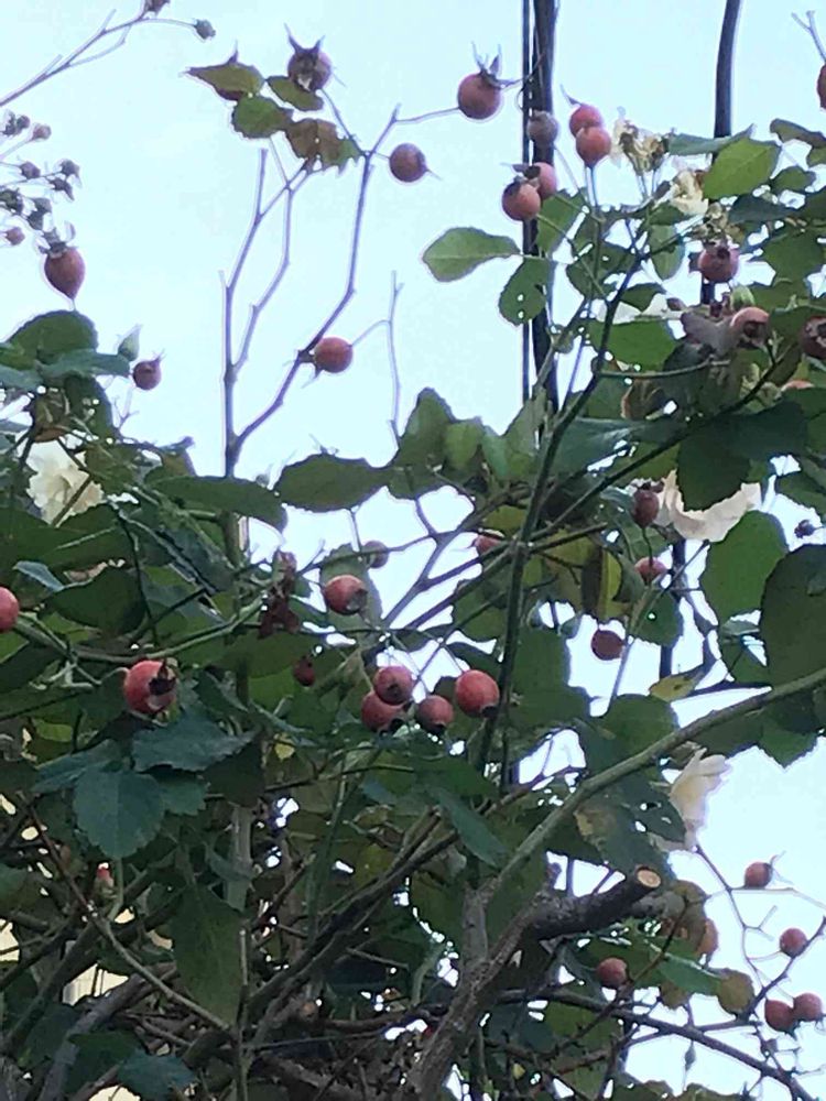 道沿いのお宅。アーチのツルバラが実を付けています。