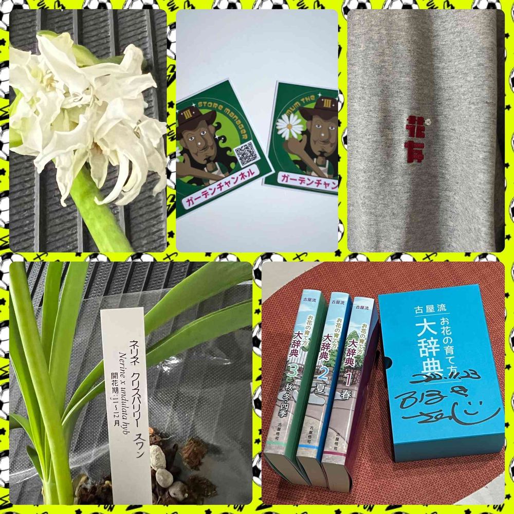 主催者カーメン君『花友Tシャツ』・横山園芸さんの『ネリネクリスパリリースワン』・はなむすびの古屋悟司さん筆『古屋流お花の育て方大辞典』その他いろいろ手に入れてきました。