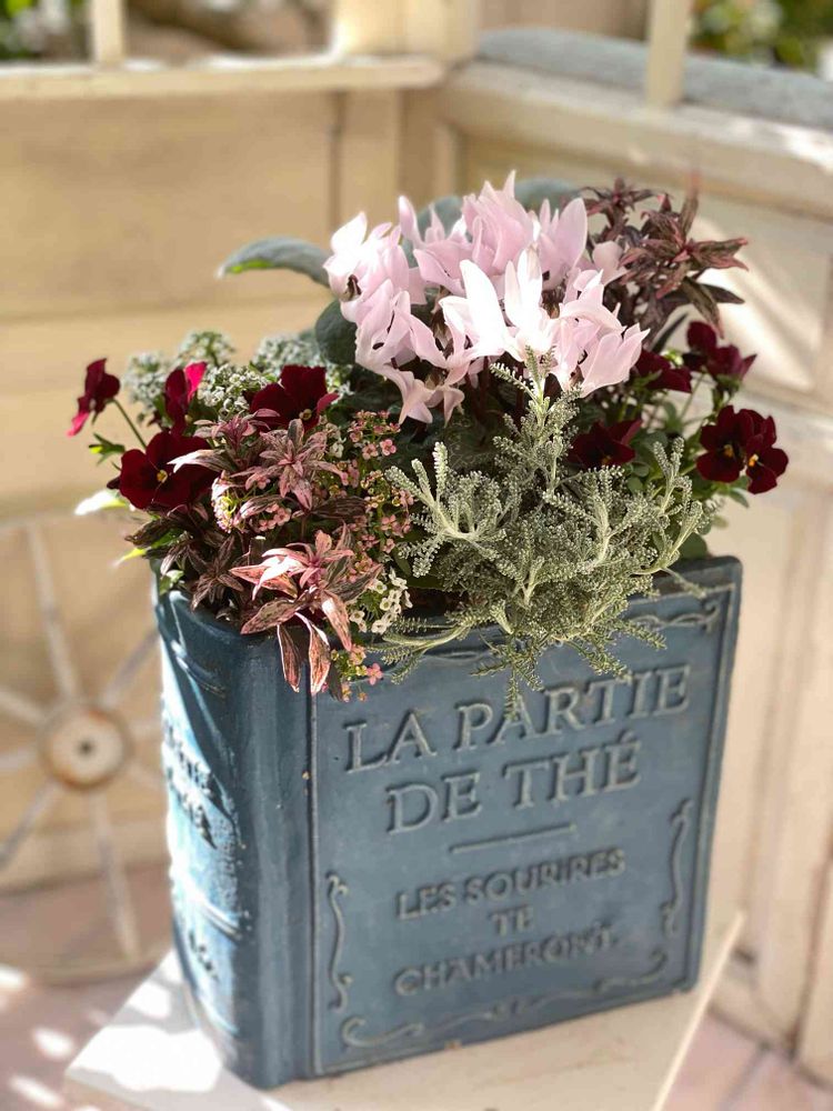 このブルーグレーの本に、桜色のガーデンシクラメン🌸