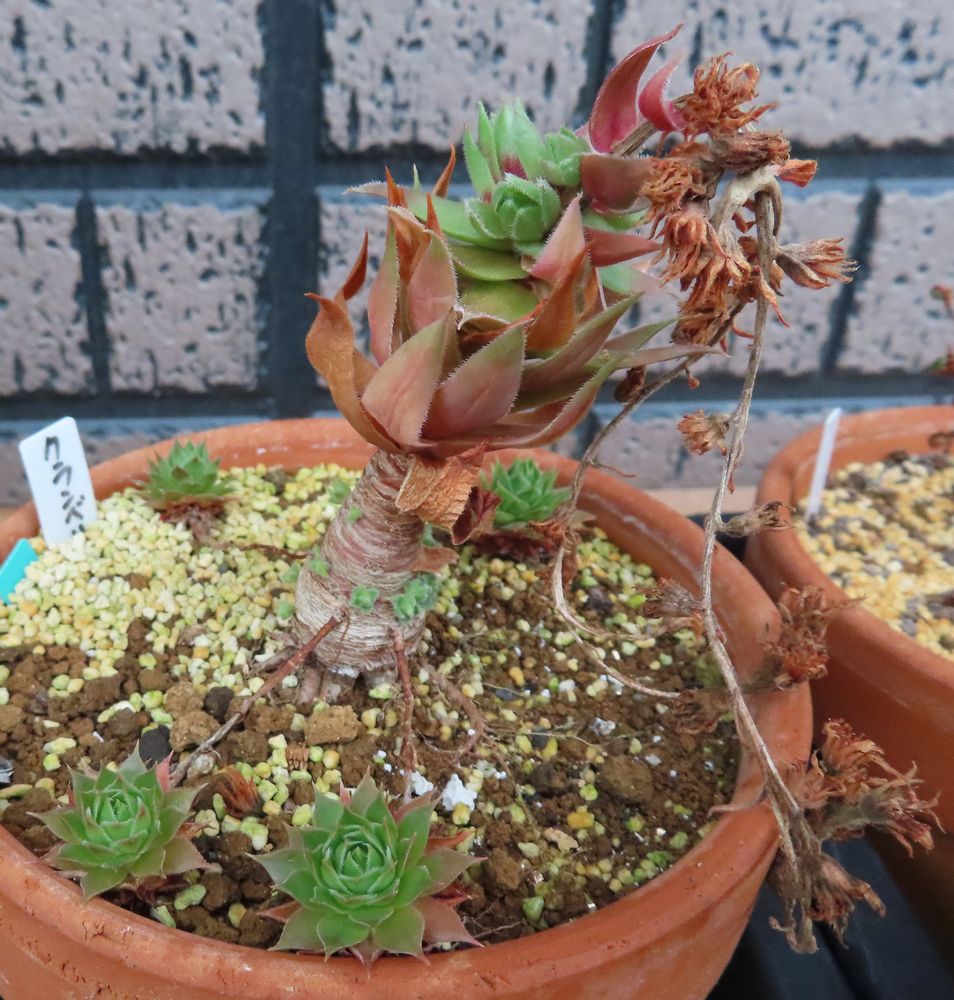 派手に花を咲かせた後のクランベリーカクテル。センペルビウムは花を咲かせると枯れてしまうと思っていたけど,先端から少しと根元からいっぱい子株が出てきた。