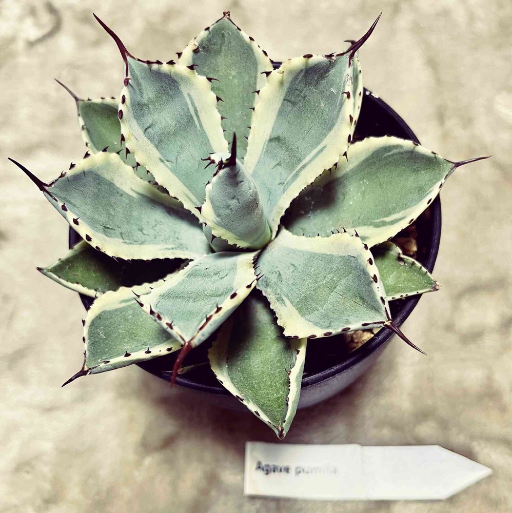 アガベ📛にはプミラと書いてありますが、雷神か吉祥冠錦かと思いながらの購入。同種の苗には全てプミラの📛