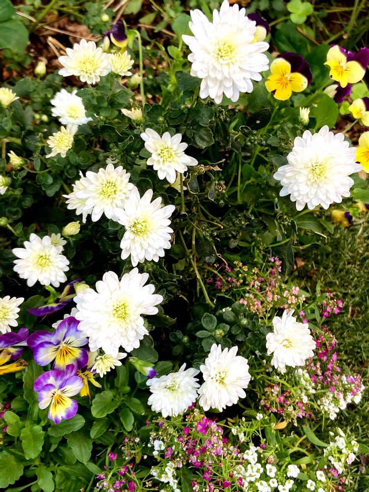 真っ白な菊の周りにたくさんのお花、楽しそうに見えます🌼🌸