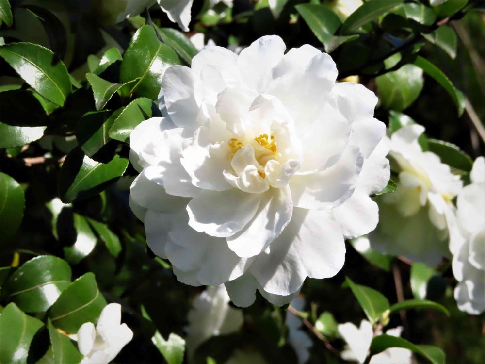 白い「サザンカ(山茶花)」が綺麗にさいていました。 パチリ