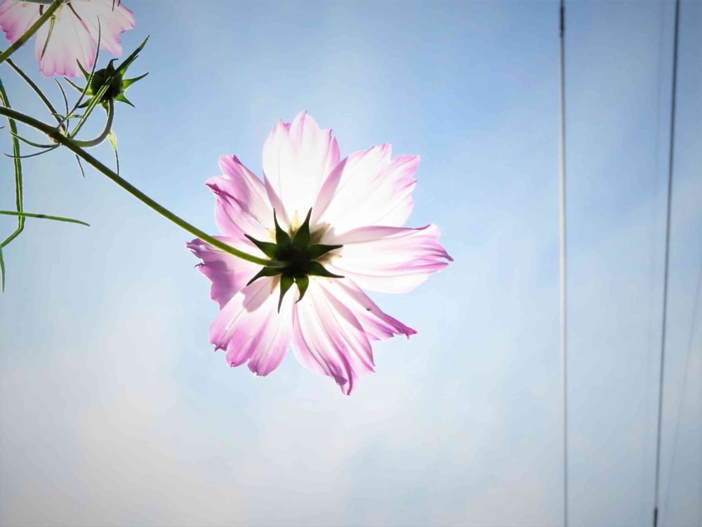 薄水色の空に薄ピンク色のコスモスの花びらが透けてとっても素敵なお写真ですね😍