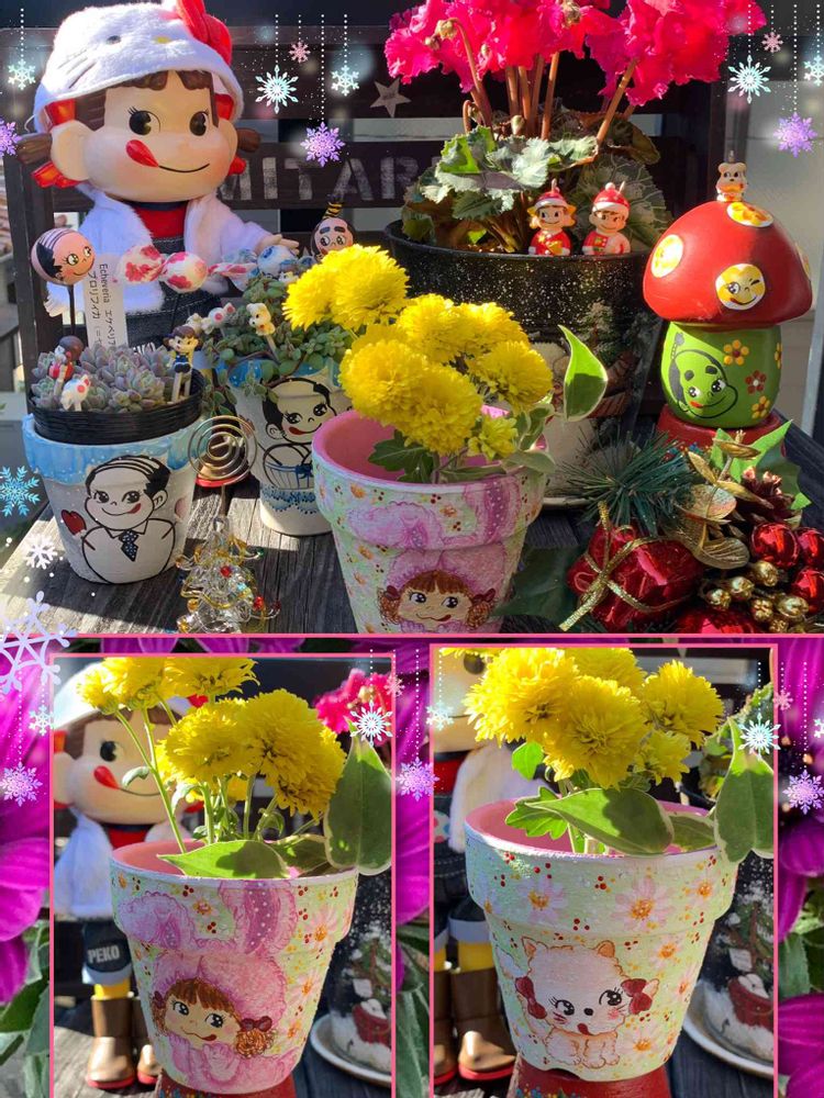 黄色い菊に可愛い手書き鉢(*ฅ́˘ฅ̀*)♡