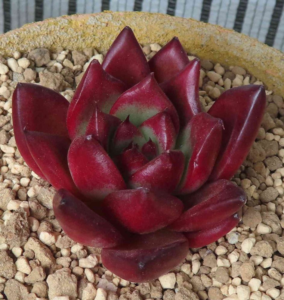 うちにいる赤い多肉の中でもトップクラスの赤さのロビン。ほとんど赤一色で,しかも濃い色。ロメオルビンとよく似ているけど,ロメオルビンの方がもう少し葉先が鋭い感じ。