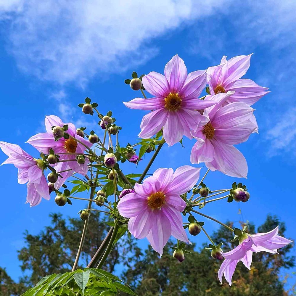 見上げる皇帝ダリアは快晴に映えるね☺️🌸