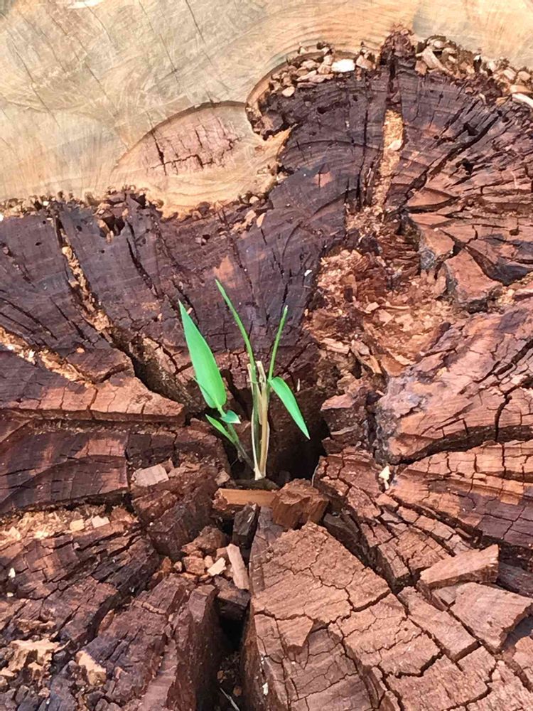散歩道。伐採された桜の老木。中心から笹が生えて来ています。