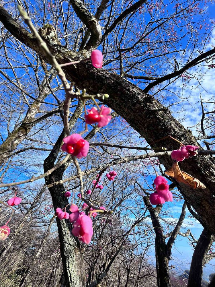 遠くから観ると梅の花?と思いましたが、近づくと可愛い身が付いていました❤️青空にピンクが映えてます!
