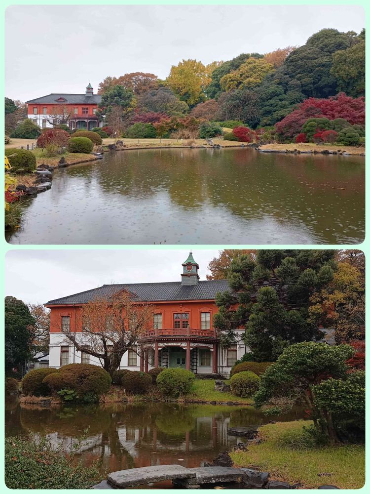オレンジの🏘️本館と赤❤️の紅葉が