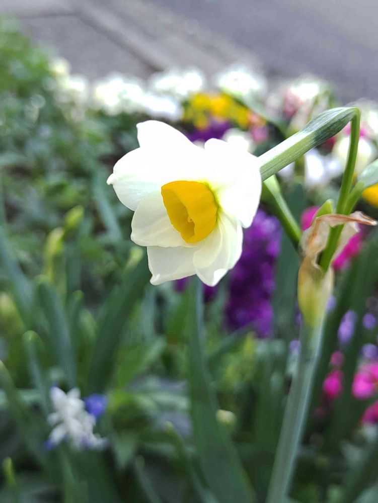 花壇の水仙、撮り始めた時は少し開きかけている状態でした。